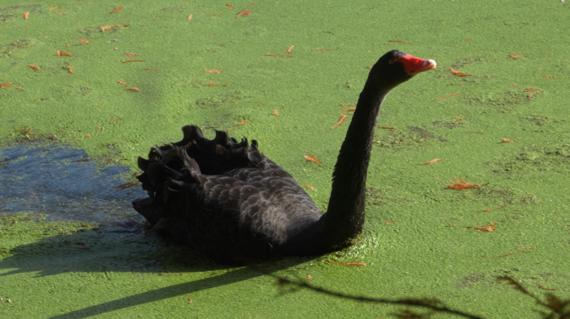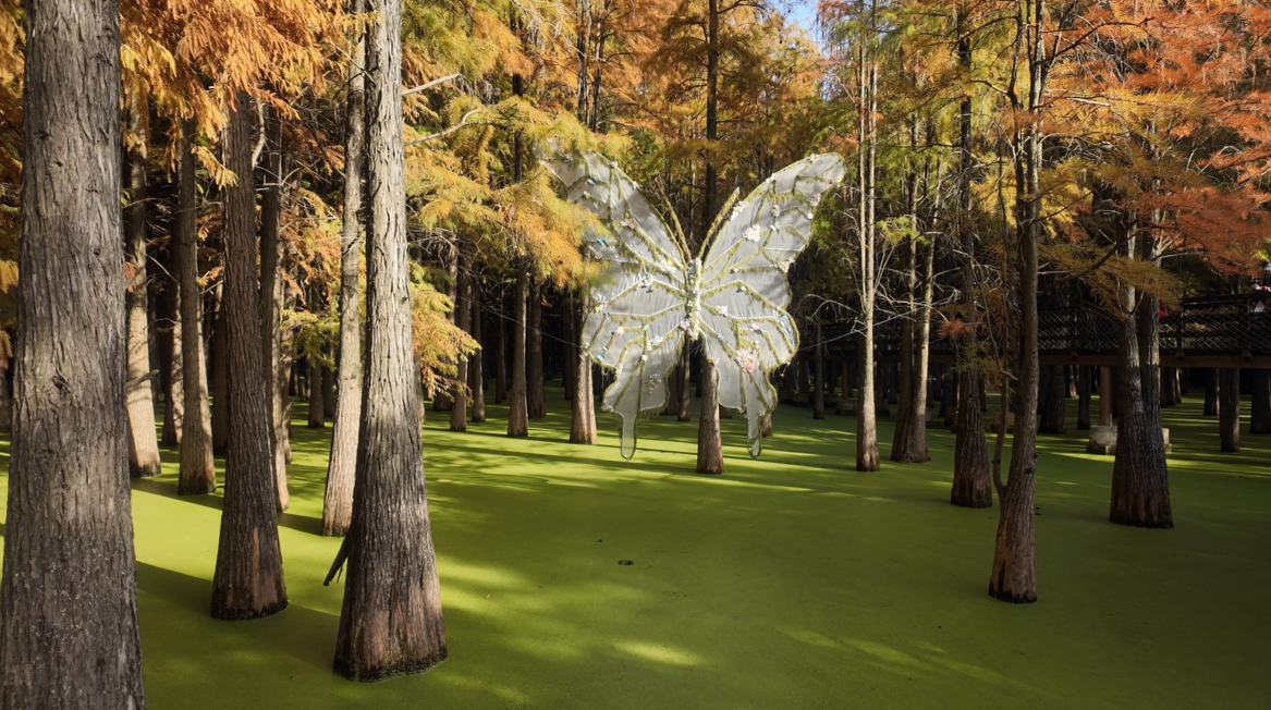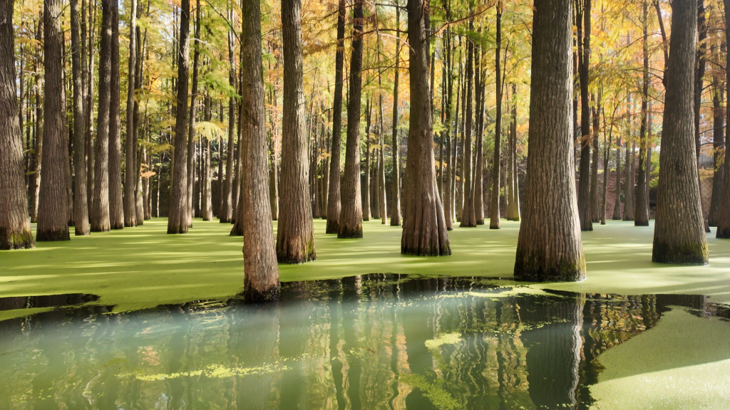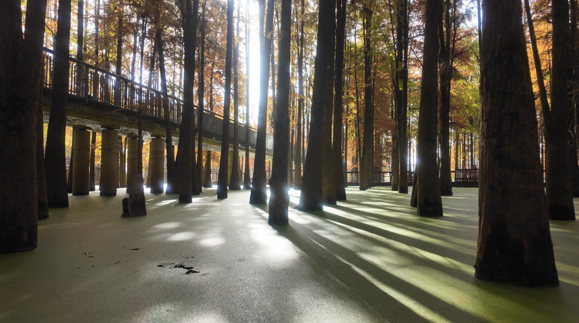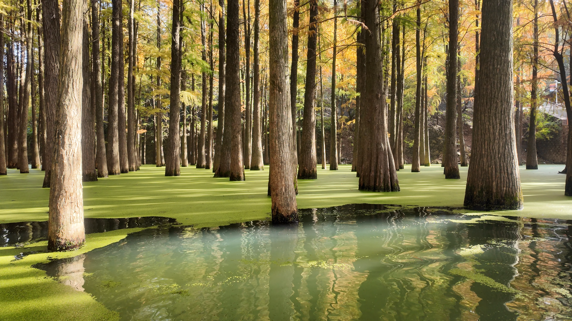 The lake looked exactly like the photos. Duckweed blanketed the water so completely that it looked like grass from above. Boardwalks ran directly over the lake, creating reflections that felt unreal.