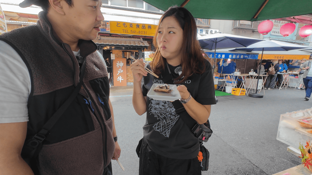 This one was Ian’s find. He spotted a stall with a beautiful display plate of scallop, uni, and ikura (salmon roe) and assumed he’d just pay and take the plate. What actually happens is way more fun: the vendor sprays your hands clean, hands you a piece of nori with their logo printed on it, then empties the entire plate onto your seaweed. You add wasabi and soy, roll it up, and eat the whole thing in one massive bite.